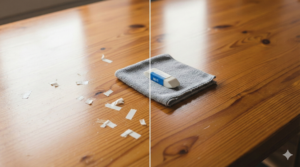 • ベストな対処: とにかく「水分」と「強い溶剤」を避けるのが鉄則です。まずは乾いた消しゴムで少しずつ落とし、それでも残る頑固な跡には、少量のハンドクリームを綿棒に取ってピンポイントで塗布しましょう。1分ほど置いて粘着剤が乳化したら、木目に沿って柔らかい布で優しく拭き取ります。最後に乾拭きをすることで、木材へのダメージを最小限に抑えながら本来の質感を保てます。