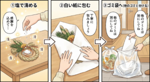- 準備: 清潔な白い紙(新聞紙でも可)を広げ、その上に正月飾りを置きます。