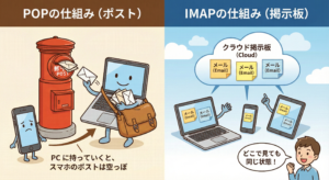これからは、POPに代わって「IMAP」という方式が主流になります。これは「サーバーにあるメールを直接見に行く」という現代的な仕組みです。