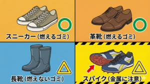 • 素材による違い: 長靴(ゴム製)や、安全靴のように大きな金属板が入っているものは「不燃ゴミ」に指定されることがあります。