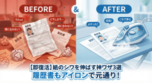 紙のシワは、**「低温アイロン+当て布」というほんの少しの手間をかけるだけで、驚くほどキレイに復活します。もしアイロンを出す時間がない場合でも、数日間じっくりと「重し」**をかけて繊維を整えてあげることで、提出に耐えうる状態まで戻すことができます。