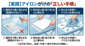 - 用意するもの: アイロン、平らなアイロン台(または硬い机)、当て布(または別の白いA4コピー用紙)、霧吹き