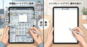便利すぎるアプリは設定や操作方法を覚えるのに時間がかかり、肝心の「考えること」を邪魔してしまうことがあります。令和ノートが大切にしていた「書くことだけに集中できる環境」を、今の最新アプリで取り戻してみましょう。