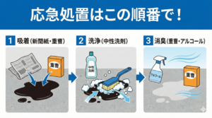 まずは吸着→回収→中性洗浄→乾燥という流れで、必要に応じて専門業者に相談してください。