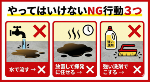 具体的に避けるべき行動は三つあり、どれも短期的には手軽に思えても結果的にシミ固定や拡散、火災リスク、コンクリート損傷につながるため厳禁です。